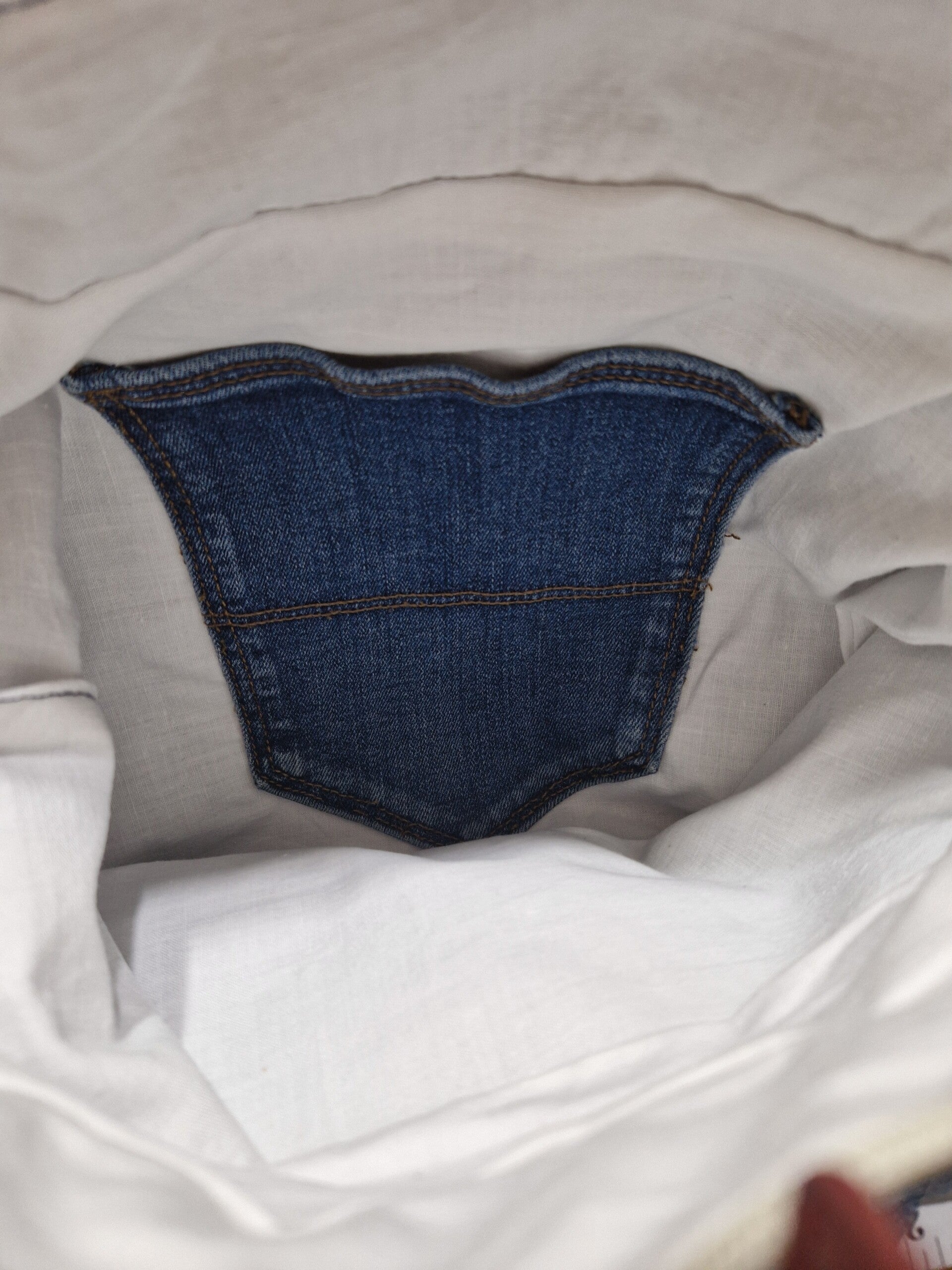 Zipped top bag made fromn soft, upcycled denim featuring a lace circle with coloured beads on the front. There is an inner jeans pocket and a long, adjustable strap for crossbody wear. The inside of the bag is lined with soft, white cotton fabric.